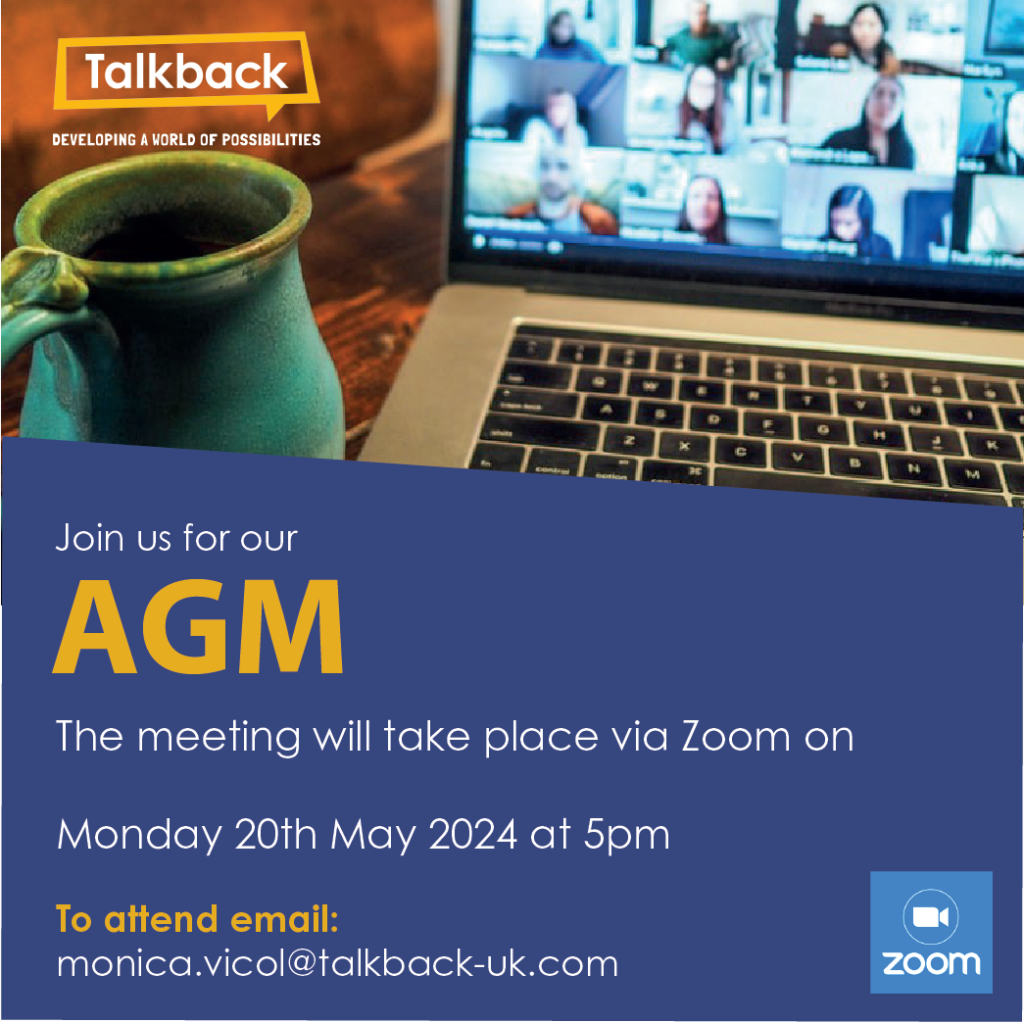 The meeting will take place on Zoom and everyone is welcome. If you would like to attend, please email monica.vicol@talkback-uk.com by the 19th May to confirm your attendance. You will then be emailed a Zoom link. When: 20th May Time: 5pm Where: Online on Zoom