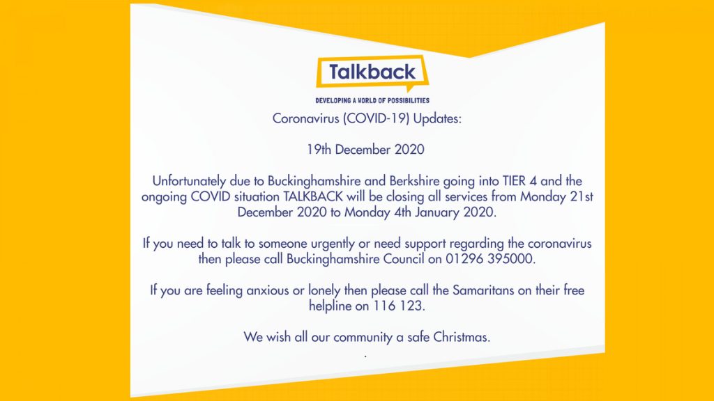 Coronavirus (COVID-19) Update: 19th December 2020 Unfortunately due to Buckinghamshire and Berkshire going into TIER 4 and the ongoing COVID situation TALKBACK will be closing all services from Monday 21st December 2020 to Monday 4th January 2020. If you need to talk to someone urgently or need support regarding the coronavirus then please call Buckinghamshire […]