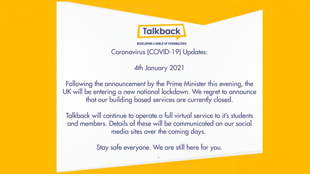 Coronavirus (COVID-19) Updates: 4th January 2021 Following the announcement by the Prime Minister this evening, the UK will be entering a new national lockdown. We regret to announce that our building based services are currently closed. Talkback will continue to operate a full virtual service to it’s students and members. Details of these will be […]